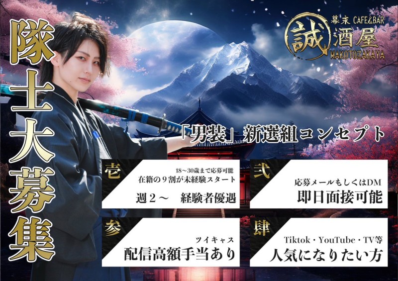 🔹男装募集🔹 誠酒屋の"新人隊士"を募集します🏯🌕 経験がある方、移籍も歓迎します🇯🇵 【在籍の9割が🔰未経験スタートのお店】 即日、面接OK👌ご応募、詳細はこちらから 👉 https://t.co/xbwZHPL2xP #秋葉原 #男装カフェ #誠酒屋 #男装バイト #コンカフェ求人 #TikTok https://t.co/CIeEkOYfOt