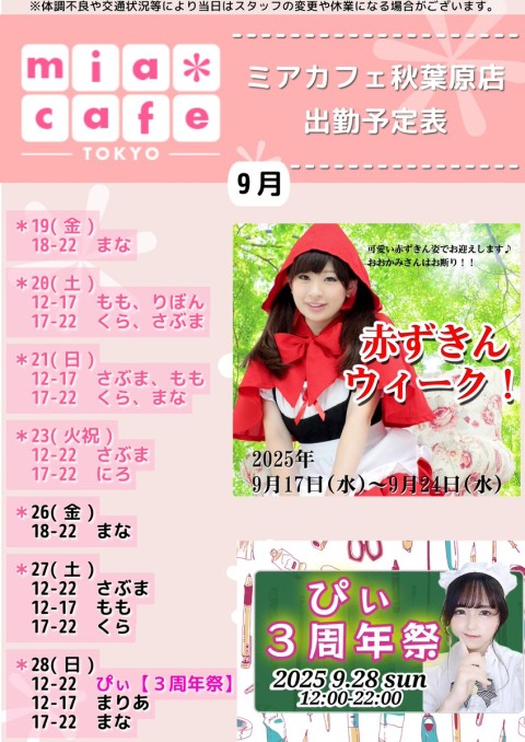 ★メイドカフェ・ミアカフェ秋葉原店★ ☕️営業予定日☕️ 🐺❤️赤ずきんウィーク🐺❤️ 🐺9月19日(金)  18-22 まな 🐺9月20日(土)  12-17 もも  12-17 りぼん  17-22 くら  17-22 さぶま 🐺9月21日(日)  12-17 さぶま  12-17 もも  17-22 くら  17-22 まな 🐺9月23日(火祝)  12-22 さぶ https://t.co/4e0aeWMAEv