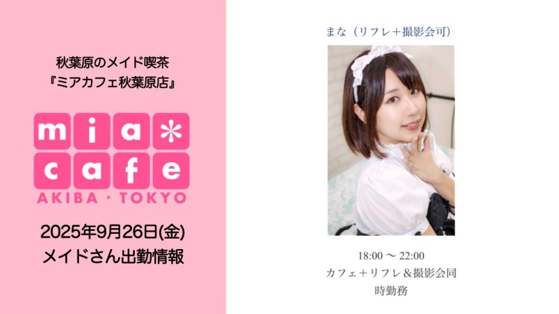 ★メイドカフェ・ミアカフェ #秋葉原 店★ ☕️営業予定日☕️ 🎀9月13日(土)  12-22 くら  12-17 さぶま  17-22 にろ 🎀9月14日(日)  12-17 みさ、新人さん【初お給仕】  17-22 さぶま、くら  リラ&フォトお呼び出し みれい 🎀9月15日(月祝)  12-17 さぶま  17-22 おとめ【卒業】、まな https://t.co/pLZUgClAe3