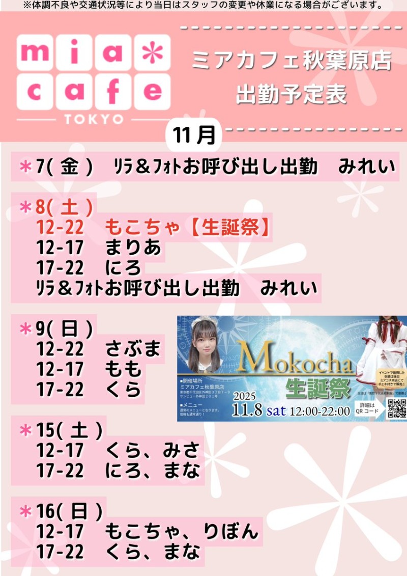 ★#メイドカフェ ・ミアカフェ #秋葉原 店★ ☕️営業予定日☕️ 🎀11月7日(金)  リラ&フォトお呼び出し出勤 みれい 🎀11月8日(土)もこちゃ生誕祭EV  12-22 もこちゃ  12-17 まりあ  17-22 にろ  リラ&フォトお呼び出し出勤 みれい 🎀11月9日(日)  12-22 さぶま  12-17 もも  17-22 くら https://t.co/zrYqBDgGKD