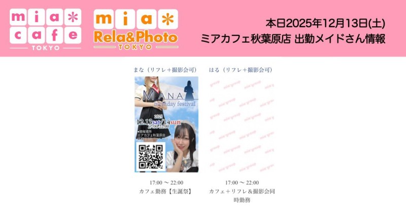 🎍#年賀状📮https://t.co/CjIVfjbH2f ★#メイドカフェ ・ミアカフェ #秋葉原 店★ ☕️営業予定日☕️ 🎀12月12日(金)  リラ&フォトお呼び出し出勤 さぶま、みれい 🎀12月13日(土)  12-17 さぶま,まりあ  17-22 🎂まな,はる 🎀12月14日(日)  12-17 くら,ふふ  17-22 🎂まな,もこちゃ #生誕祭 https://t.co/lyQuFXVzNt