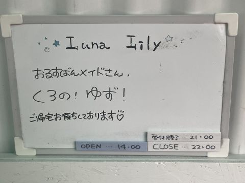 本日9月27日(金)のお留守番メイドは、 15時~ ゆず、みづき です。 お留守番予定でした「くろの」ですが、おやすみとさせていただきます。 皆様のお帰りをお待ちしております。 #ルナリリー #メイドリフレ #メイド #大阪日本橋 https://t.co/1qOiWcbyOv