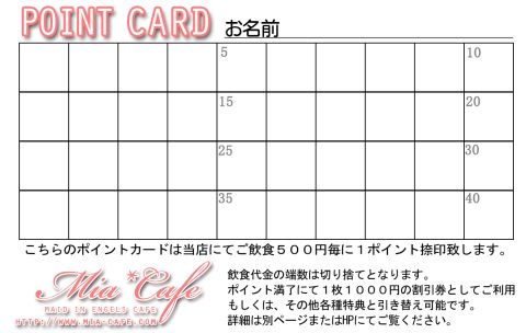 特兞 スタンプカヌドは円毎にお぀スタンプ臎したす。 端数は切り捚おずなりたすので、ご了承䞋さい。 尚、スタンプカヌド枚に぀きコたで捺印できたす。 スタンプカヌド満了で、円の割匕刞ずしおご利甚可胜です。