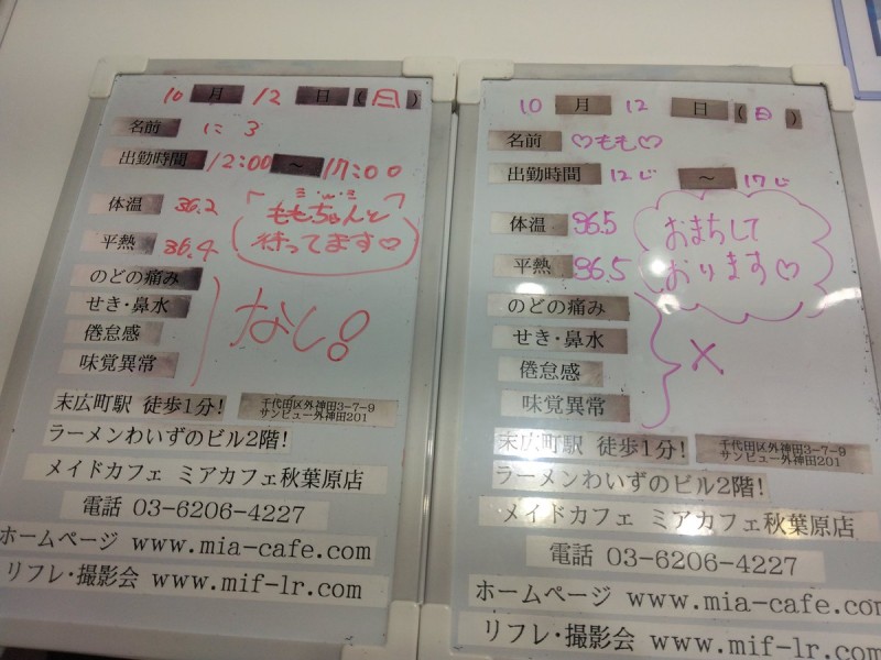 | 営業時間 | ●ミアカフェ東京店(メイドカフェ)http://www.mia-cafe.com/ ● □平日 月~金 17:00~22:00 □土曜・日曜・祝日 12:00~22:00 ★定休日 なし(2019年1月より定休日廃止) □ラストオーダー 閉店の60分前 22:00閉店の場合→21:00ラストオーダー 営業日や出勤状況についてはこちら。 http://pandaland.cutegirl.jp/mif/c_cms_csv/sch_top.php ●ミアリラ&フォト東京店(撮影会&リフレ)http://www.mif-lr.com/ ● □全日 12:00〜22:00 ですがリラクゼーション出勤スタッフがいる時間帯のみ営業です。 ★定休日は不定休(出勤スタッフがいる時間帯の営業) □最終受付 閉店の45分前 22:00閉店の場合→21:15(21:50迄に施術時間が終わるコース) ※高校生不可 ●深夜営業については、公式サイト右上の http://market.chu.jp/schedule1/sche37.cgi ミアグループ総合スケジュール(PC・スマホ) http://market.chu.jp/schedule1/sche37.cgi?dm=1 ミアグループ総合スケジュール(ガラ携帯) をご覧ください。告知日のみ営業となります。告知日以外は深夜営業いたしておりません。 深夜営業対象日 22:00〜翌朝5:00(L.O.4:00) | ||||||||||||||