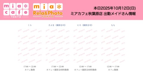 営業時間 ●ミアカフェ東京店(メイドカフェ)http://www.mia-cafe.com/ ● □平日 月~金 17:00~22:00 □土曜・日曜・祝日 12:00~22:00 ★定休日 なし(2019年1月より定休日廃止) □ラストオーダー 閉店の60分前  22:00閉店の場合→21:00ラストオーダー 営業日や出勤状況についてはこちら。 http://pandaland.cutegirl.jp/mif/c_cms_csv/sch_top.php ●ミアリラ&フォト東京店(撮影会&リフレ)http://www.mif-lr.com/ ● □全日 12:00〜22:00 ですがリラクゼーション出勤スタッフがいる時間帯のみ営業です。 ★定休日は不定休(出勤スタッフがいる時間帯の営業) □最終受付 閉店の45分前  22:00閉店の場合→21:15(21:50迄に施術時間が終わるコース) ※高校生不可 ●深夜営業については、公式サイト右上の http://market.chu.jp/schedule1/sche37.cgi ミアグループ総合スケジュール(PC・スマホ) http://market.chu.jp/schedule1/sche37.cgi?dm=1 ミアグループ総合スケジュール(ガラ携帯) をご覧ください。告知日のみ営業となります。告知日以外は深夜営業いたしておりません。 深夜営業対象日 22:00〜翌朝5:00(L.O.4:00)